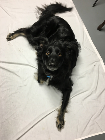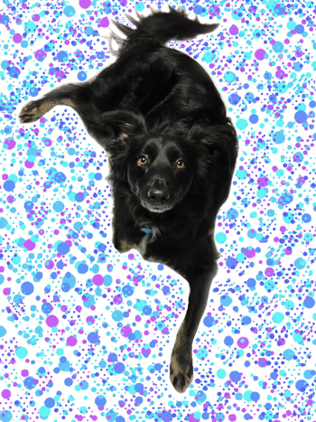 First I duplicated the original photo layer and locked the original layer. Then I selected the dog shape with the lasso tool and deleted the background outside of the selection of that layer. Next to make the fun looking background I made a new white layer behind the dog shape layer. Added a transparent layer above the white later. With the rough dry brush selected I used it like a stamp and clicked in random spots on the screen, changing the size, and switched between 4 different colors. The last thing I did was go to the dog shape layer. With the soft edge brush set to overlay and 30% opacity; I lightened the dogs’ face to make it stand out from the body.